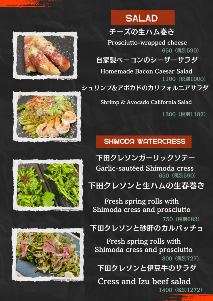ココナッツシュリンプは見た目はエビフライですが、食べてみると少し香るココナッツと自家製メープルソースをディップして食べるとスウィーツ感覚になります。下田クレソンは食べたらサラダ好きな方は虜になる間違いなしです。