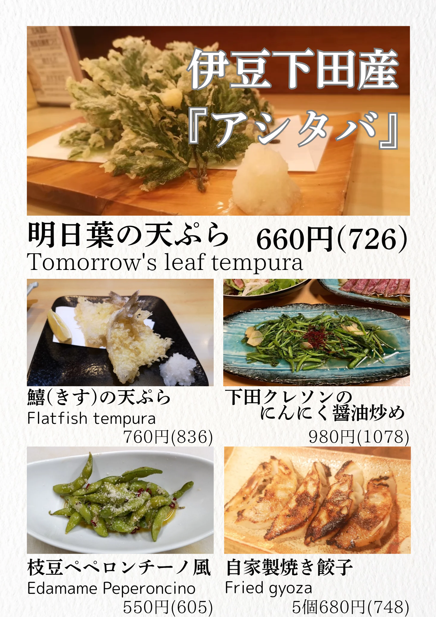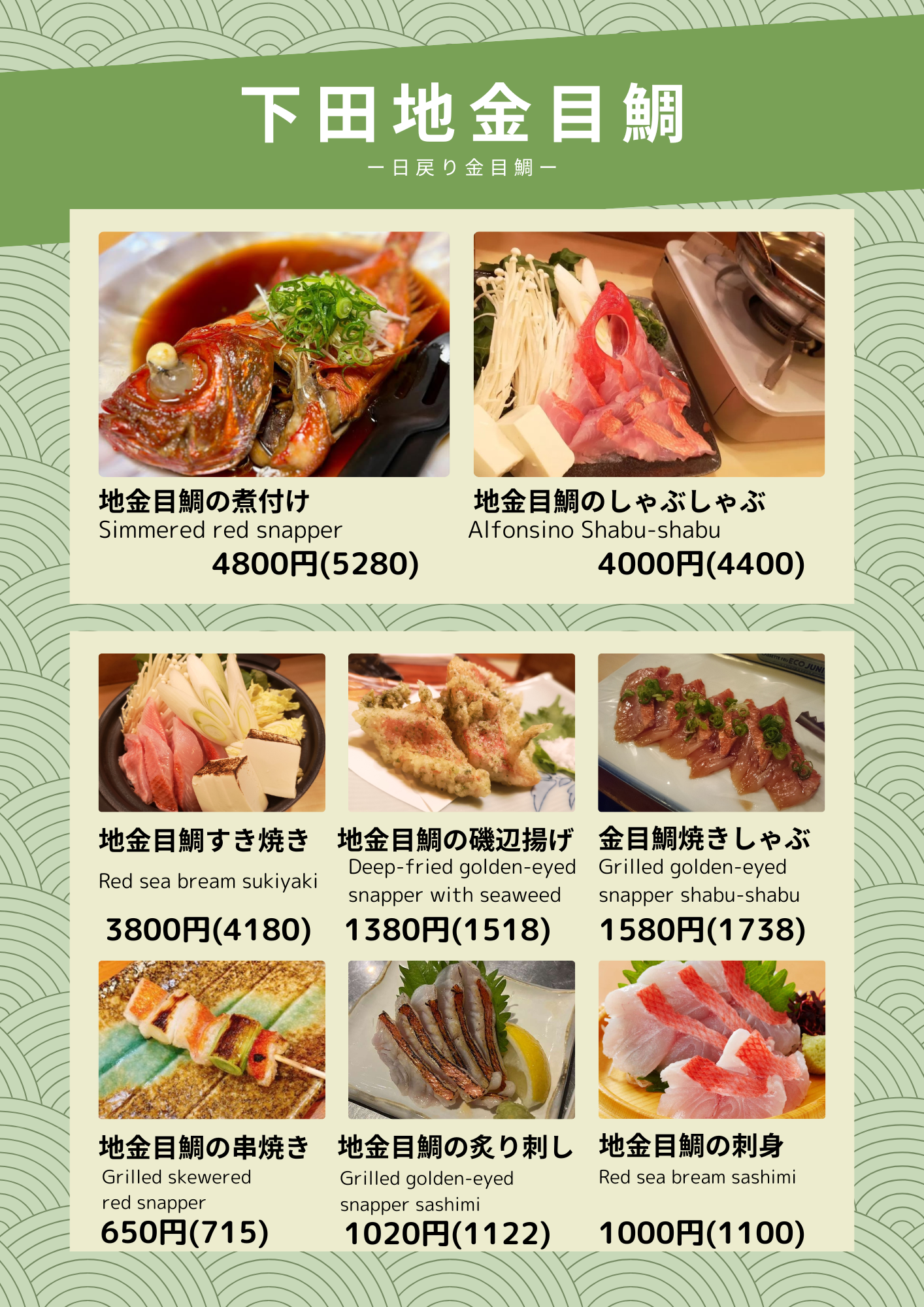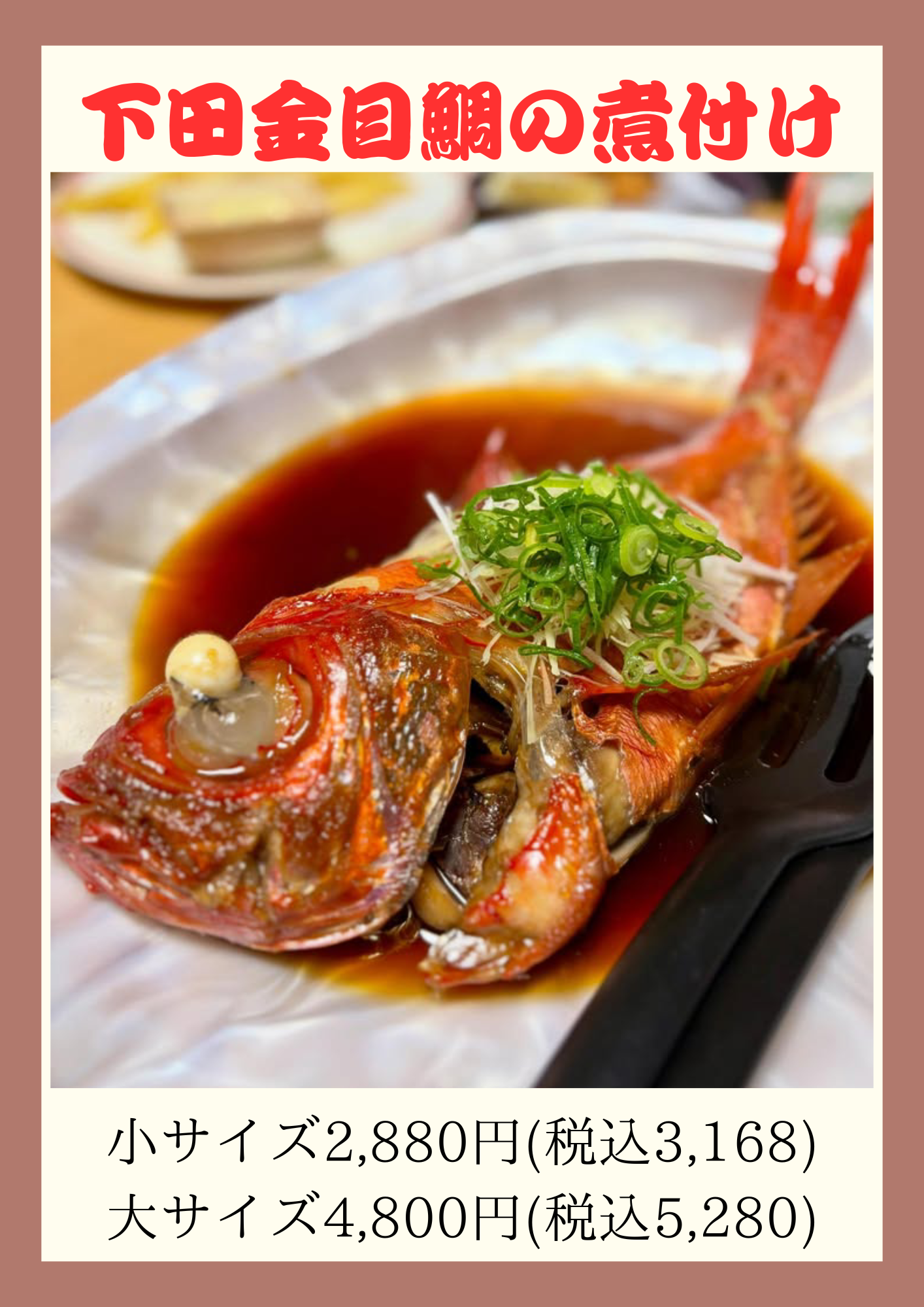 下田のマイマイ通りにある「なかなか」では、新鮮な地金目鯛をはじめ、地物の鮮度抜群のお刺身はもちろん、明日葉の天ぷらや肉料理、お酒が進むおつまみも充実。お席はゆったりとした50席をご用意しており、2階には最大24名様まで収容可能な大座敷と、10名様用の個室もございます。駅近の好立地で集まりやすく、忘年会や新年会などの各種ご宴会もお気軽にお問い合わせください。